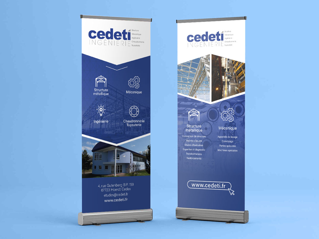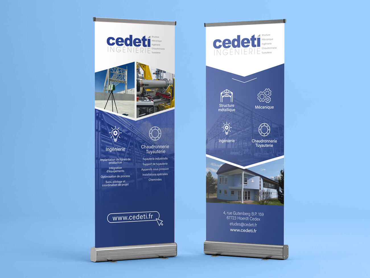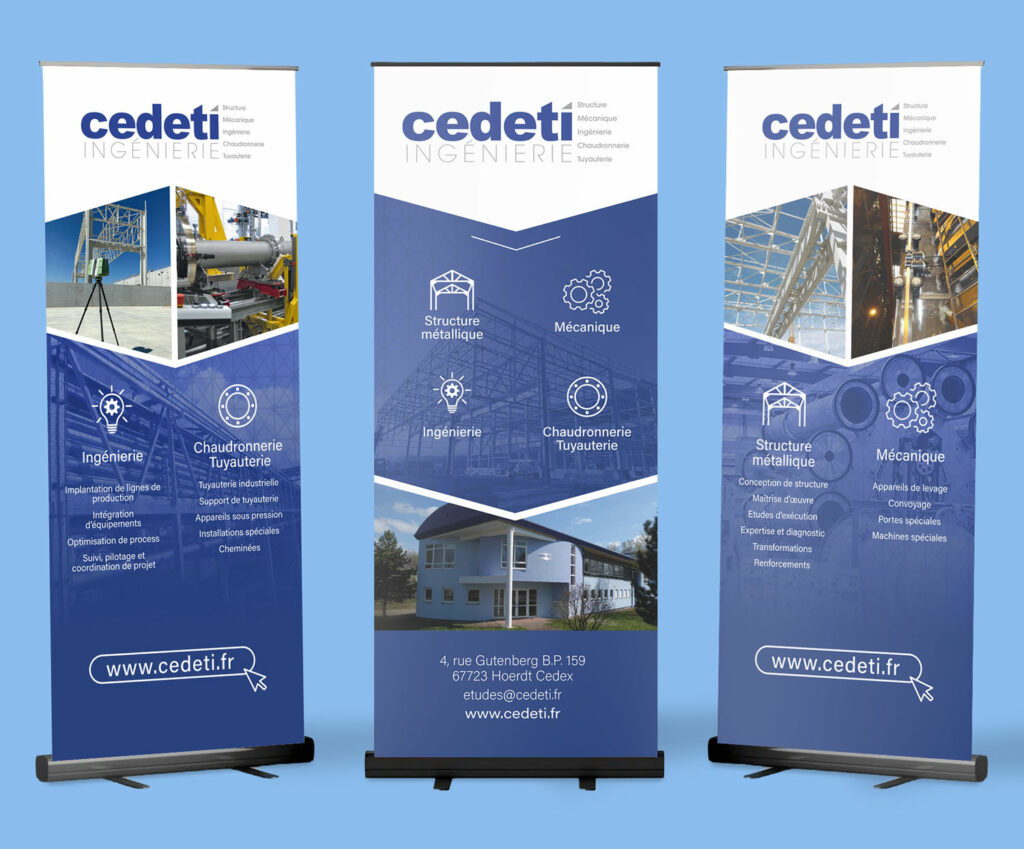 Dans le cadre de ce projet pour l’entreprise Cedeti Ingénierie j’étais en charge de la conception de trois roll-up destinés à présenter les différentes activités de l’entreprise lors de salons et événements professionnels. L’objectif était de proposer des supports de communication clairs, impactants et cohérents, capables de refléter le savoir-faire technique de Cedeti dans les domaines de la structure métallique, la mécanique, l’ingénierie et la chaudronnerie-tuyauterie.