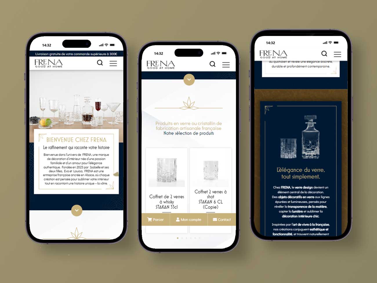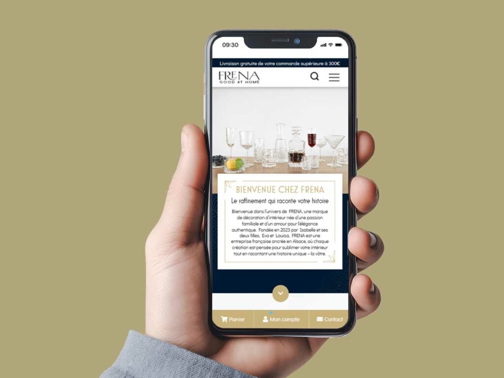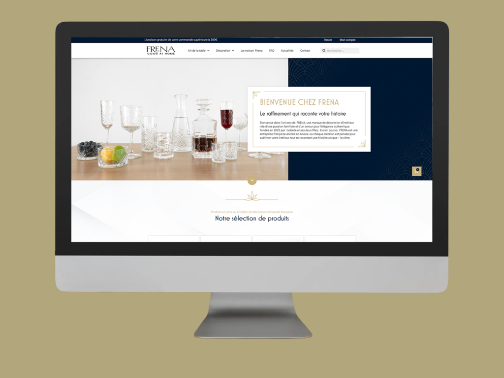 Création d’un site vitrine e-commerce pour une marque française d’objets de décoration et de verrerie artisanale, valorisant l’esthétique, la qualité des produits et l’identité visuelle raffinée de FRENA.