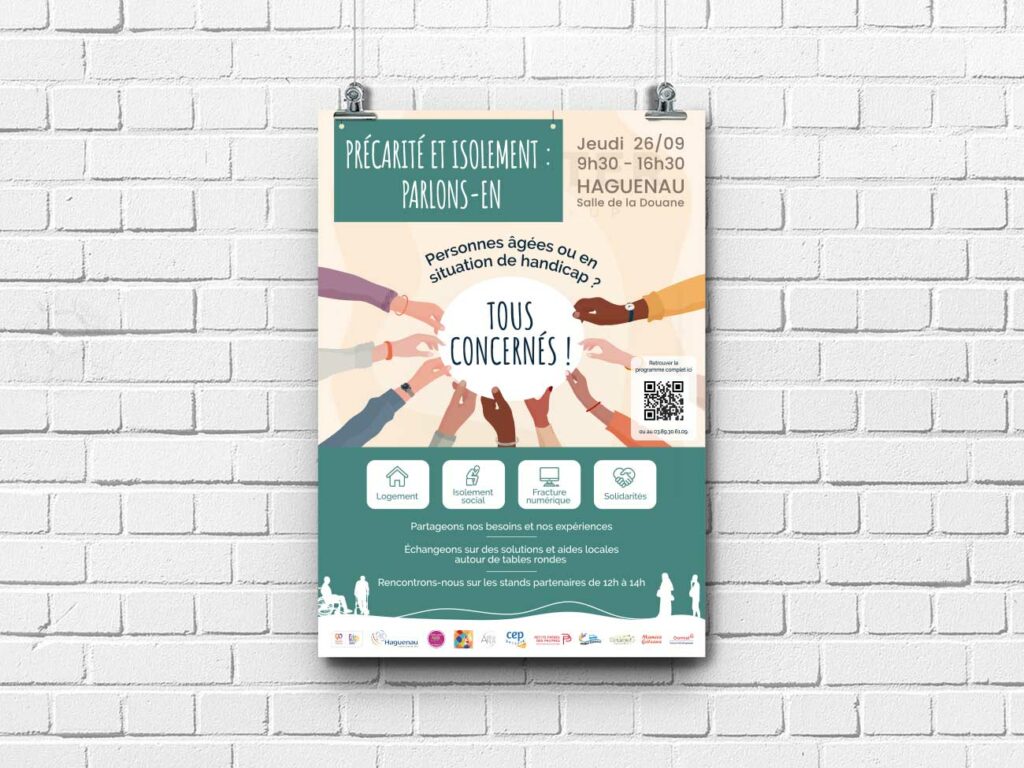 Dans le cadre de l’événement « Précarité et isolement : parlons-en », organisé par le CDCA Alsace (Conseil Départemental de la Citoyenneté et de l’Autonomie), j’ai été chargé de concevoir un roll-up ainsi qu’une affiche A3 destinés à accompagner la communication de l’événement.