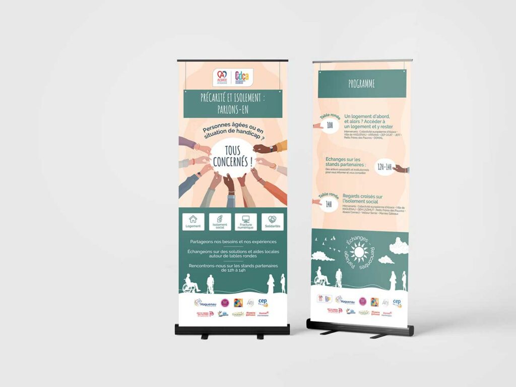 Création d’un roll-up et d’une affiche A3 pour un événement institutionnel du CDCA Alsace autour des thématiques de la précarité et de l’isolement.
